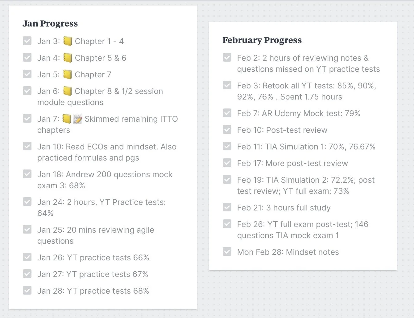 Going at my own pace: As you can see, I didn't study every day - that would have been too much for me. I took breaks when I needed to, but I still made sure these breaks weren't too long. I kept an eye on making sure I was weekly making progress towards my goal of scoring higher in practice tests and feeling confident in my knowledge of project management concepts.